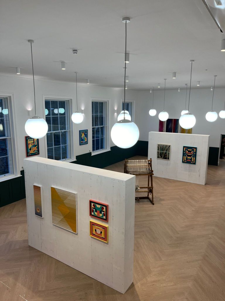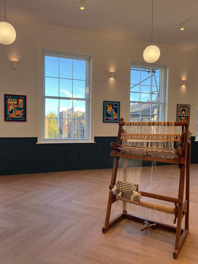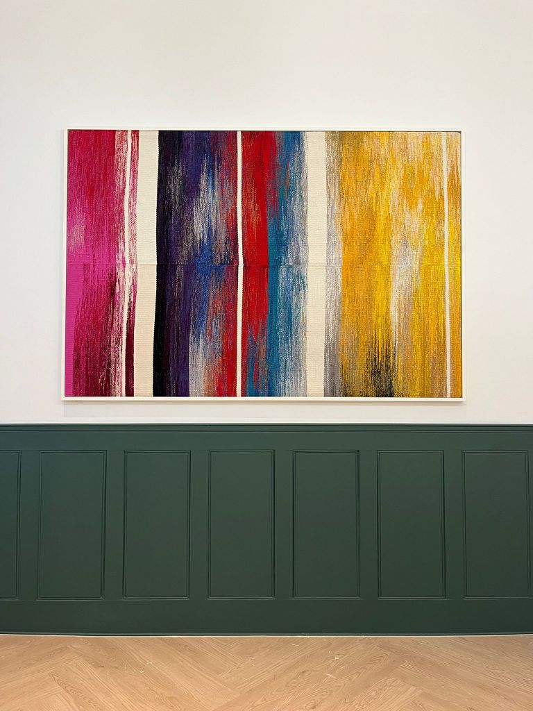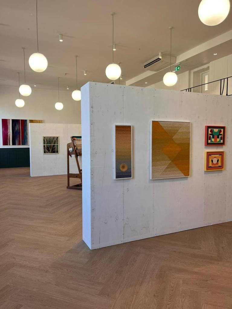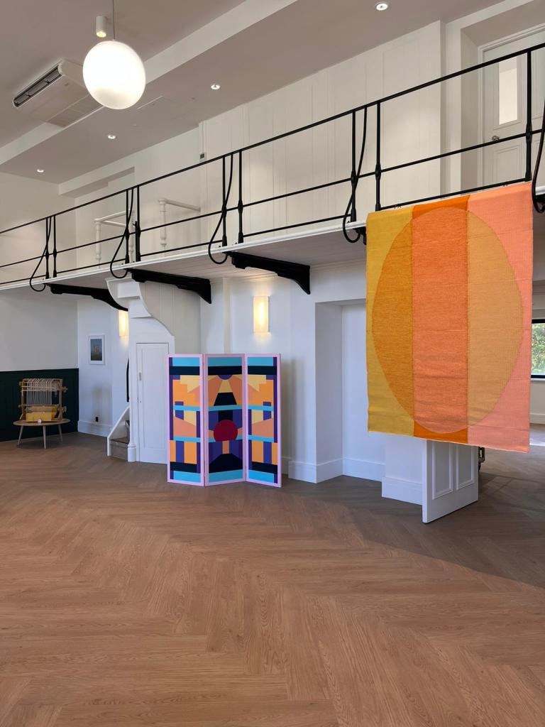 An exhibition of two mediums: Sara’s weaving practice embodies a deep respect for materials and craftsmanship, where attention to detail and the processes involved in dyeing and weaving create works that are rich in texture and depth. Caroline’s abstract paintings invite viewers into a world of geometric forms and vibrant hues, transforming architectural shapes into visual narratives. Both artists are interested in how their respective mediums can be used to build community and exist within public space. In this interview, they discuss what kinds of crossovers can be found between paintbrush and thread. Theexhibition considered the legacies of crafting, textiles and weaving from modernism to the contemporary, both celebrating and challenging the avant-garde work of the weaving workshop.